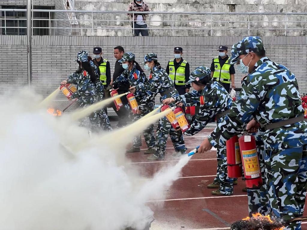 疏散演练结束后,2022级新生在运动场上,进行了消防器材的操作使用训练。教官们手把手指导学生使用灭火器进行“火灾”现场的模拟扑灭训练,同学们参与热情高涨并纷纷表示,灭火训练提高了他们的消防安全意识和扑灭初始火情的能力。