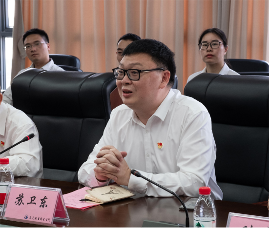 党委副书记蔡东宝对苏卫东副院长一行的到来表示热烈欢迎,并介绍了我校和基层党组织建设等情况,他表示学校会积极搭建庭校共建、法治同行、协同发展平台,推进法院干警与高校教师的队伍建设,在法制教育与专业建设方面先行探索,促进高校毕业生就业,推动法治教育与现代化高职人才培养的融通发展。市第一法院党组成员、副院长苏卫东分享了法院党建工作的亮点和优秀经验,他希望能与我校建立长期合作意向。
