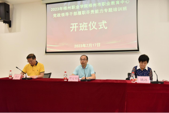 7月17日下午,2023年梧州职业学院梧州市职业教育中心党政领导干部履职尽责能力专题培训班在我校开班。学校党委副书记、校长贺定修,梧州职业学院副校长姚冰,学校继续教育学院院长苏江出席开班仪式。梧州职业学院、梧州市职业教育中心党政领导干部46人参加培训。
