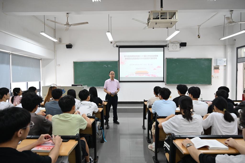 党委副书记、校长贺定修以《学习宣传贯彻党的二十届三中全会精神 争做担当民族复兴大任的时代新青年》为题,为24级建智2、3班的同学们讲述了一堂启示深远的思政课。贺定修校长表示,中国共产党第二十届中央委员会第三次全体会议于2024年7月15至18日在北京召开。会议听取和讨论了习近平总书记受中央政治局委托所作的工作报告,审议通过了《中共中央关于进一步全面深化改革、推进中国式现代化的决定》。他从进一步全面深化改革的指导思想、进一步全面深化改革的总目标、进一步全面深化改革的原则、进一步全面深化改革的重大举措四个方面内容深入讲解了党的二十届三中全会的核心内容。