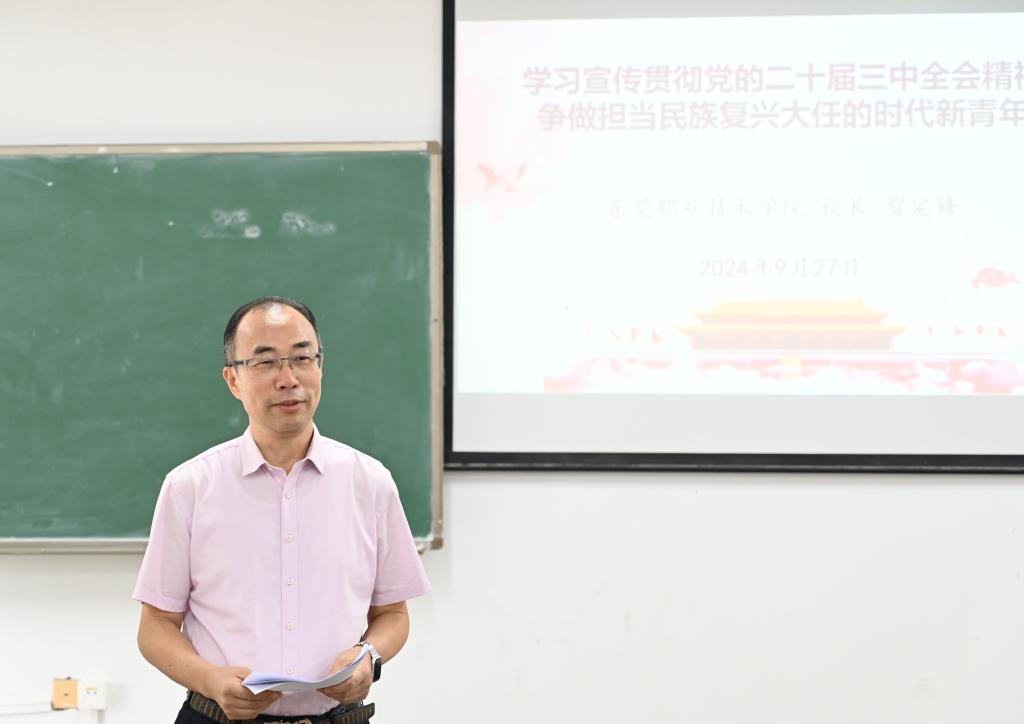 贺定修校长指出,大学生要深刻把握党的二十届二中全会以来党和国家事业取得的伟大成就,更加坚定自觉坚持“两个确立”、做到“两个维护”,坚定“四个自信”,在思想上、行动上和党中央保持高度一致。要将全会精神融入日常学习中,勇于担当作为,脚踏实地。他表示,学校建校15年来,累计为社会培养了5万多名技术技能人才,同学们学本领、展才智,为推动产业数字化、绿色化、高端化发展持续发力。当下,东莞的电子信息、高端装备制造、新材料、新能源等产业都在不断进行技术升级,食品、服装和家具等优势传统产业也在大力推进“智改数转”,希望同学们持续精技、学好本领定能大放异彩。