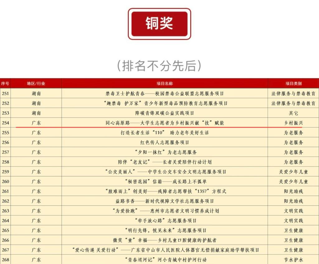 近日,由共青团中央、中央社会工作部、民政部、水利部、文化和旅游部、国家卫生健康委、中国残联和中共广东省委、广东省人民政府联合主办的第七届中国青年志愿服务项目大赛在广东汕头顺利落幕,我校“同心高原路——大学生志愿者为乡村振兴献‘技’赋能”项目获国赛铜奖。这也是该项目自2017年组建以来,历经7年首次实现我校志愿服务国家级奖项零的突破。