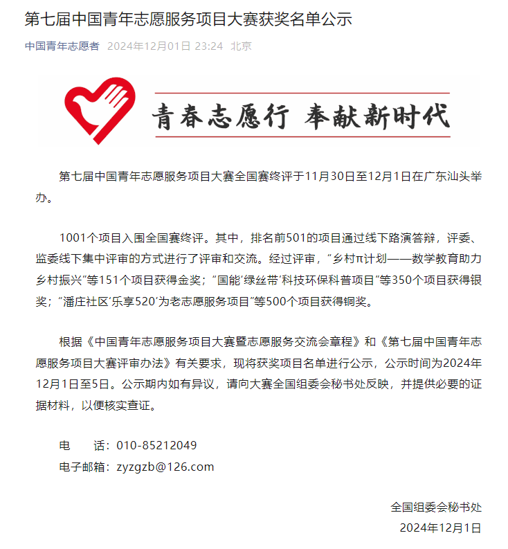 第七届中国青年志愿服务项目大赛获奖名单公示