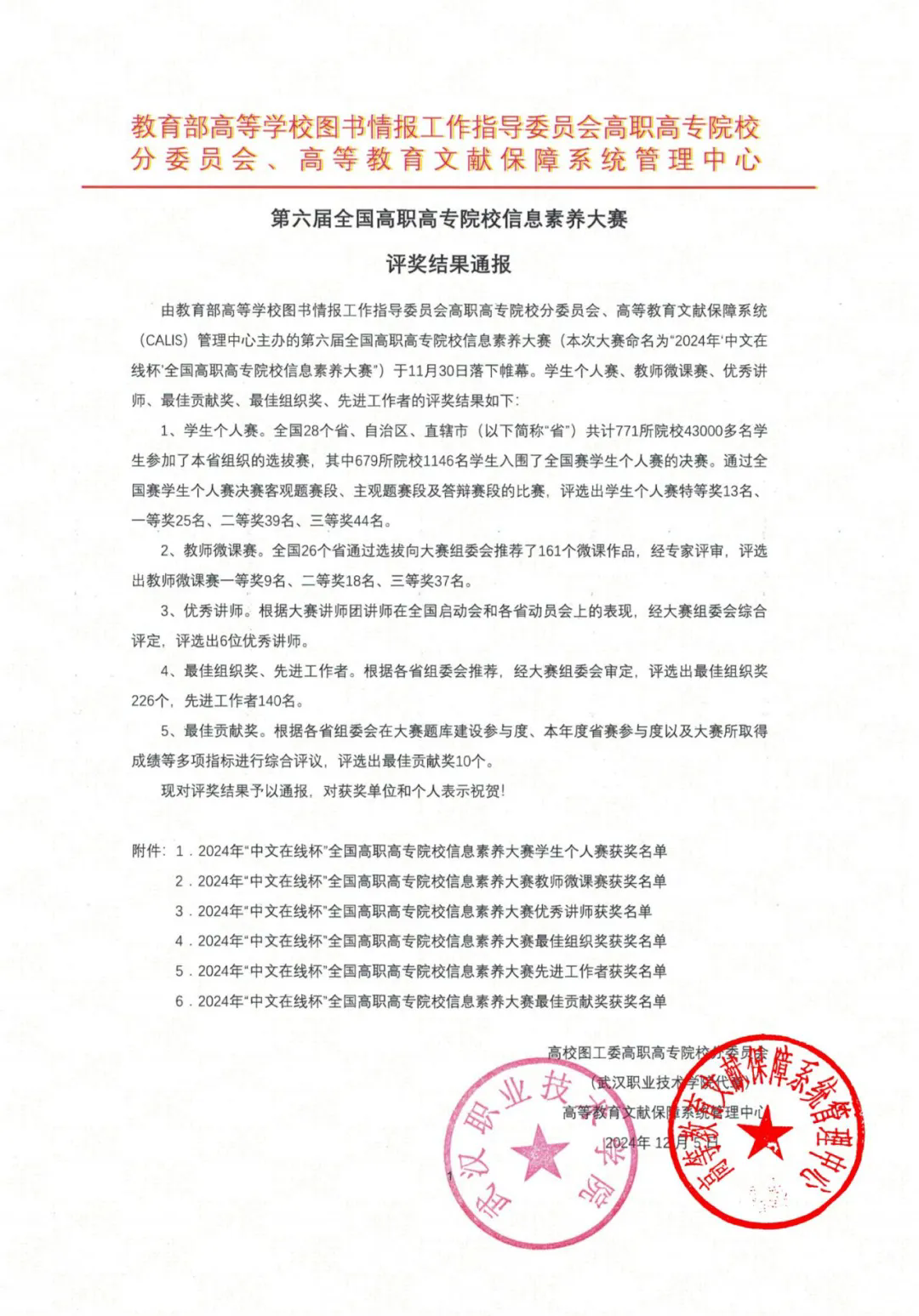 12月11日,2024年第六届全国高职高专院校信息素养大赛决赛顺利落幕,我校商贸学院2022级王熙来同学荣获全国二等奖,电子信息学院2024级李伟杰同学获广东省二等奖。同时,吴惠茹、侯君洁、黄珊老师荣获全国决赛“优秀指导教师”奖,吴惠茹老师荣获“优秀讲师”奖,我校荣获最佳组织奖。