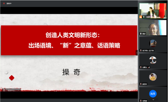 我校马克思主义学院操奇教授应邀参会并作了主旨发言。会上,操奇教授以《创造人类文明新形态:出场语境、“新”之意蕴、话语策略》为题,从人类文明新形态的出场语境、“新”之意蕴:形态学和类型学的复合框架、奠基于理论创新的“文明”话语策略共三个方面阐述,认为文明就是人类的一种进步的高级活法,而人类的活法主要包括想法、做法、说法,理论创新贡献想法、实践创新贡献做法、话语创新贡献说法。操奇教授的主旨发言得到了主办方、与会专家们的一致认可与赞誉,会中再次被主办方邀请日后作线下专题主旨报告。这也一定程度上提高了我校马克思主义学院的知晓度和关注度。