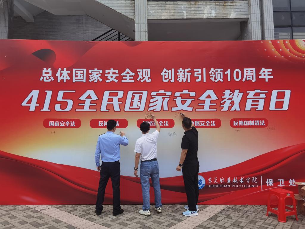 4月16日上午,学校保卫处联合东莞市公安局松山湖分局在滋兰餐厅前开展国家安全宣传活动。东莞市公安局松山湖分局红棉派出所副所长周汉强、学校保卫处全体人员和部分师生参与活动。