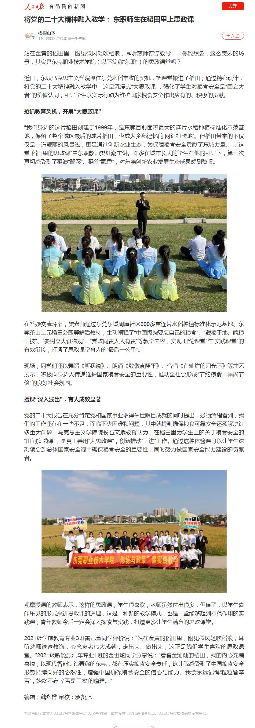 【人民日报】将党的二十大精神融入教学: 东职师生在稻田里上思政课